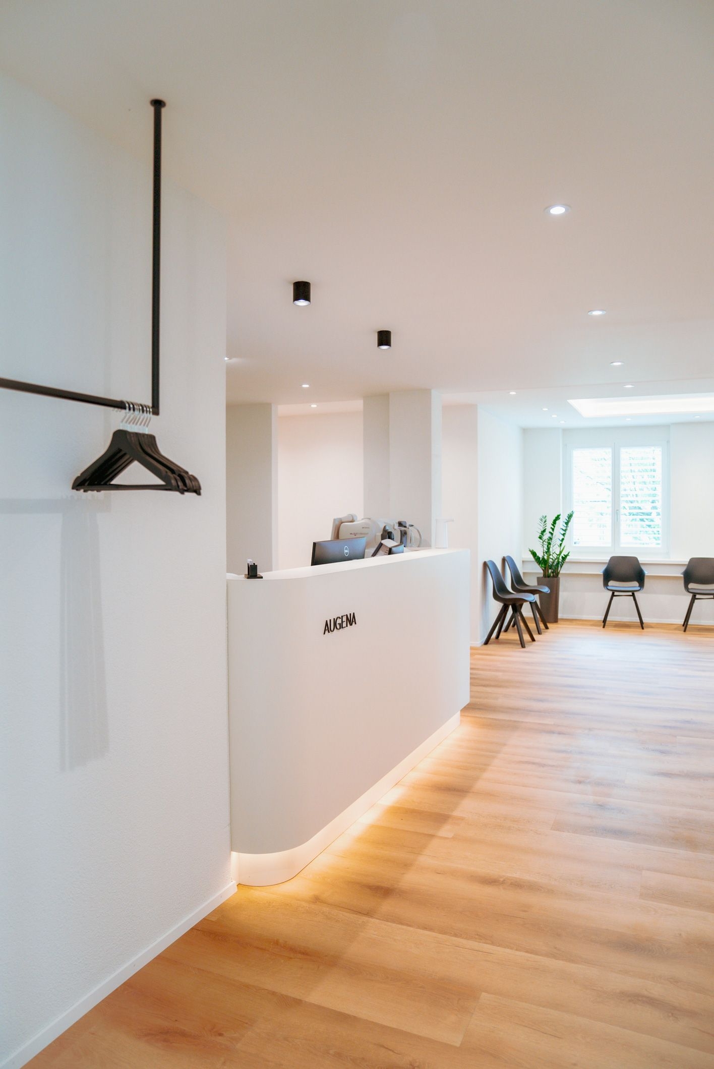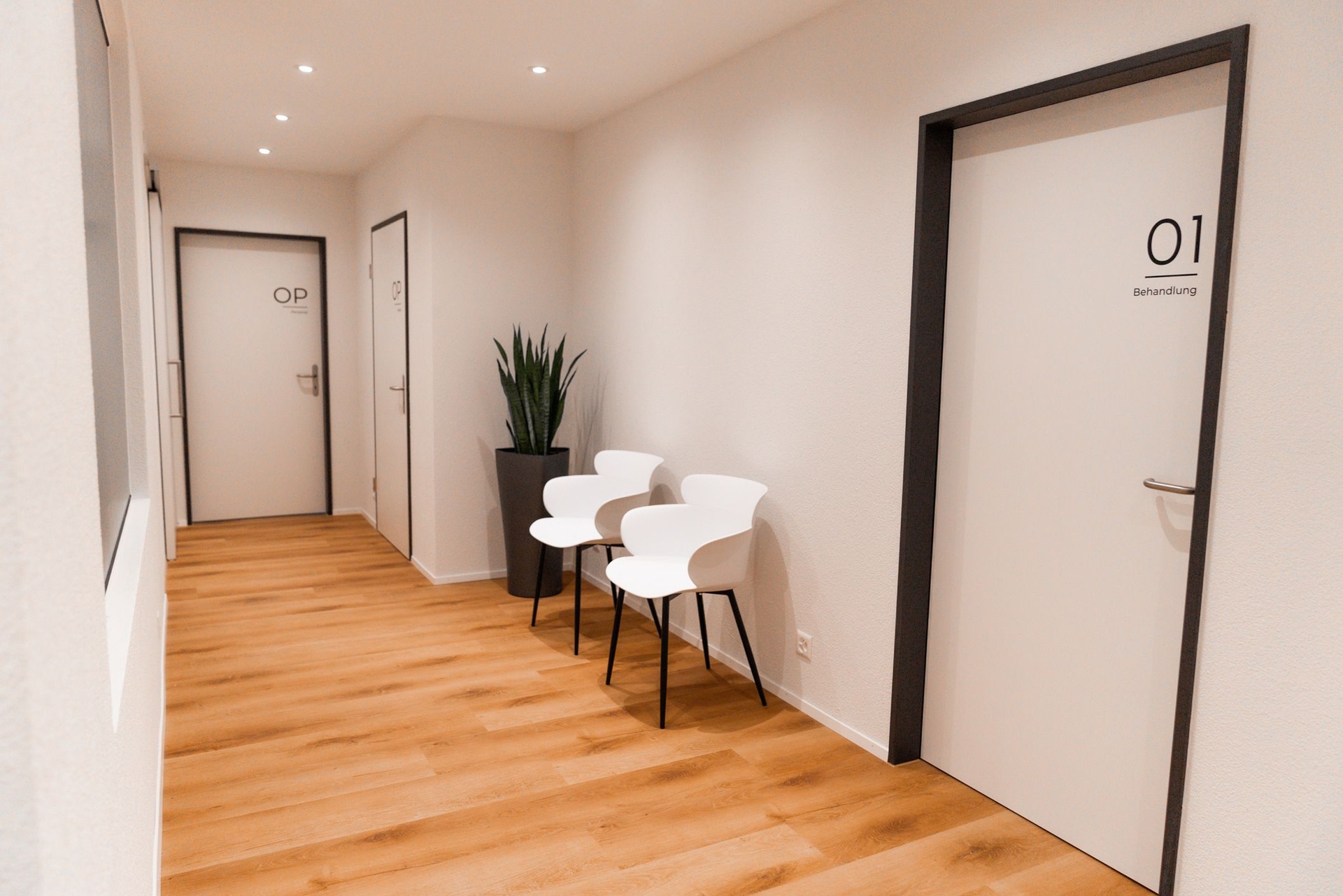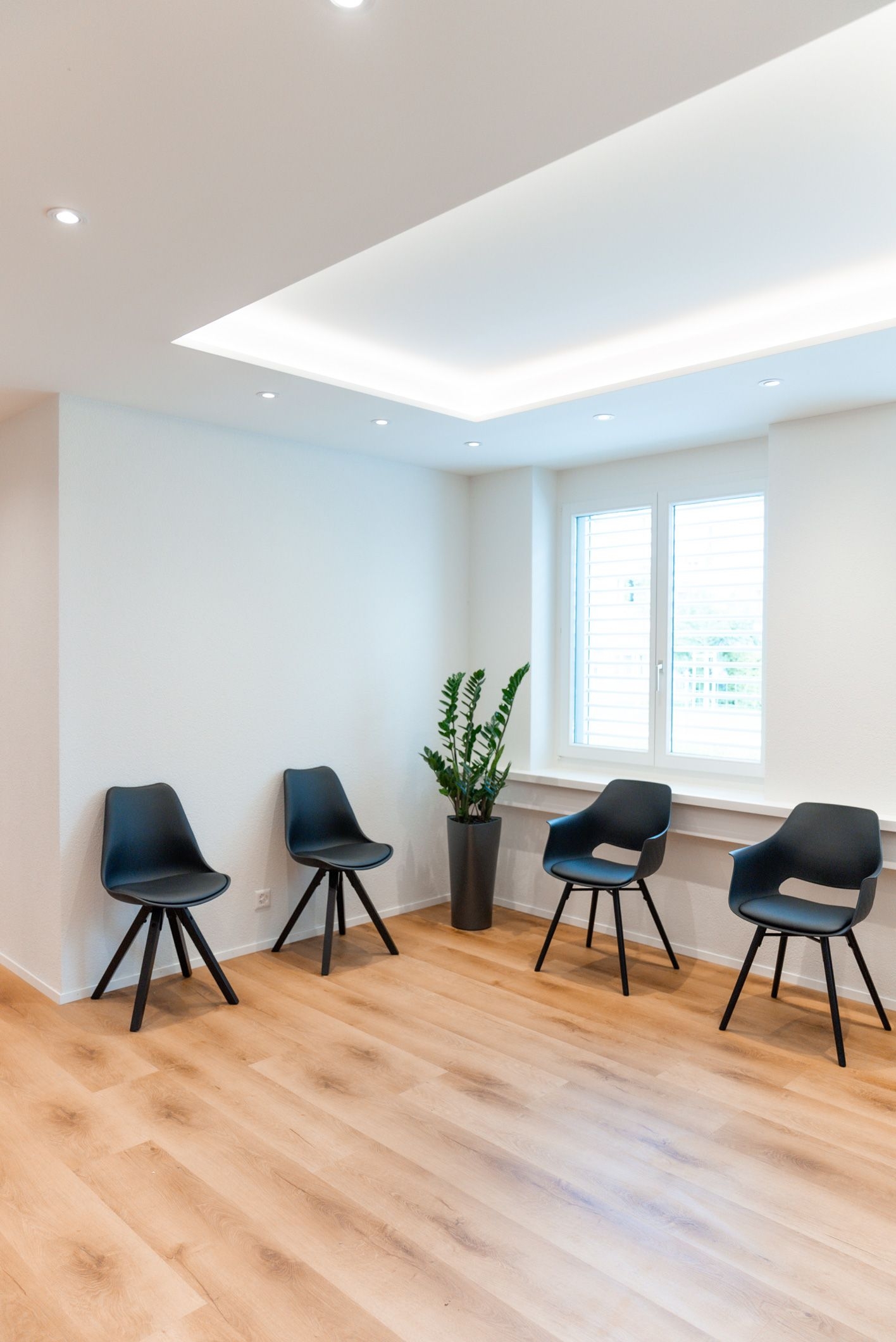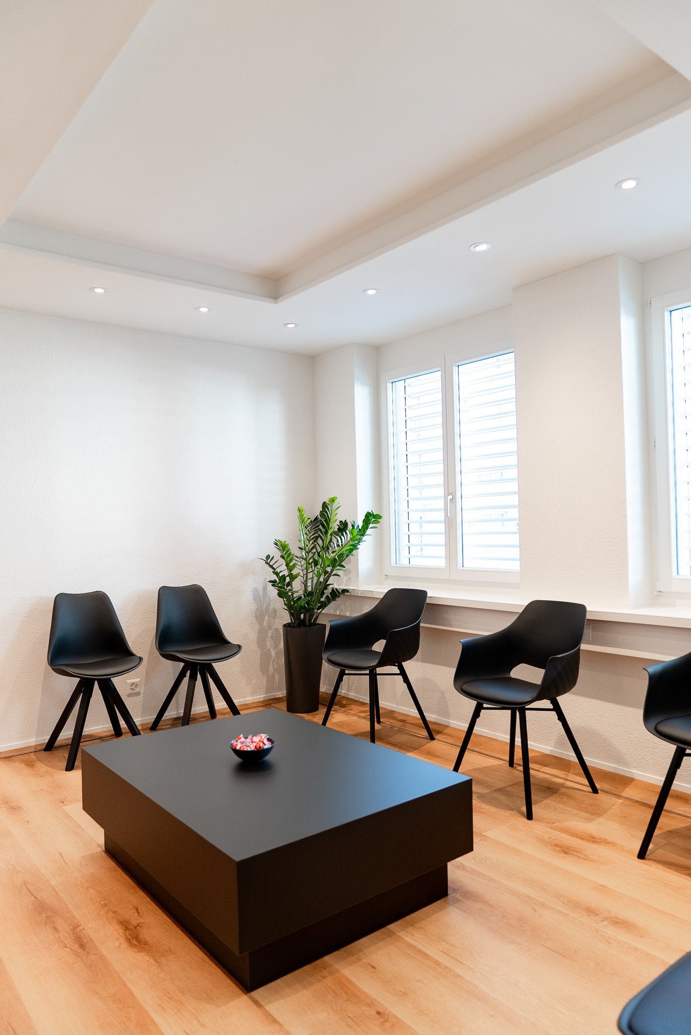 Mit einem klaren Fokus auf minimalistische Ästhetik im Boutique-Praxis-Stil haben wir den gesamten Designprozess – von der Planung bis zur Realisierung – übernommen. Massgeschneiderte Schreinerarbeiten in leichten, hellen Nuancen und weichen Formen, kombiniert mit Eichenholz, schaffen eine aufgeräumte Umgebung und fügen sich nahtlos in das Raumkonzept ein. Das durchdachte Lichtkonzept akzentuiert den warmen Charakter der Räume. Der gezielte Einsatz dunkler Kontraste unterstreicht den sportlichen Charme der Unternehmensphilosophie und verleiht dem Design zeitlose Eleganz. Das Herzstück ist die Deckenerhöhung im Wartebereich, die durch indirektes Licht dem Raum mehr Luftigkeit verleiht.