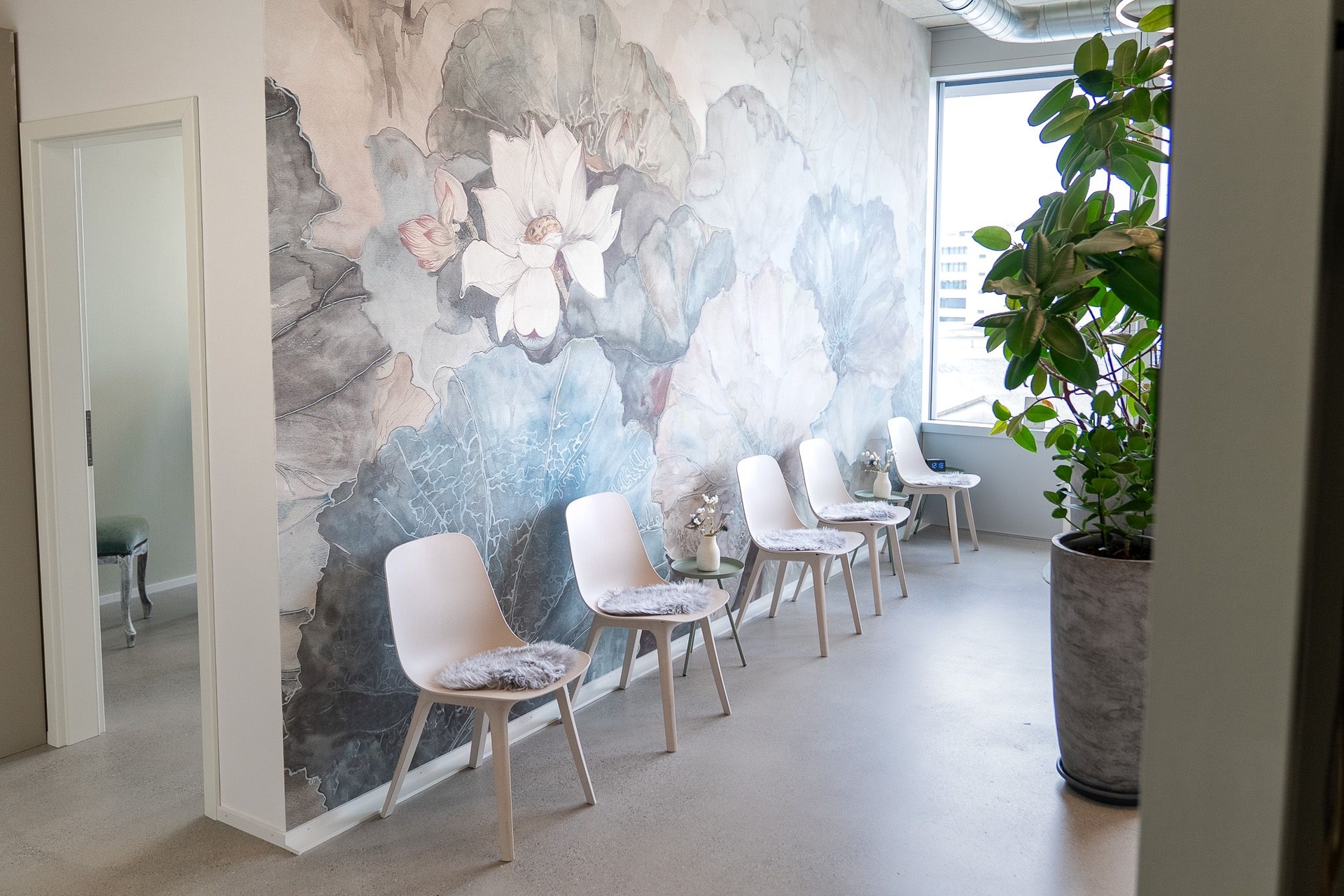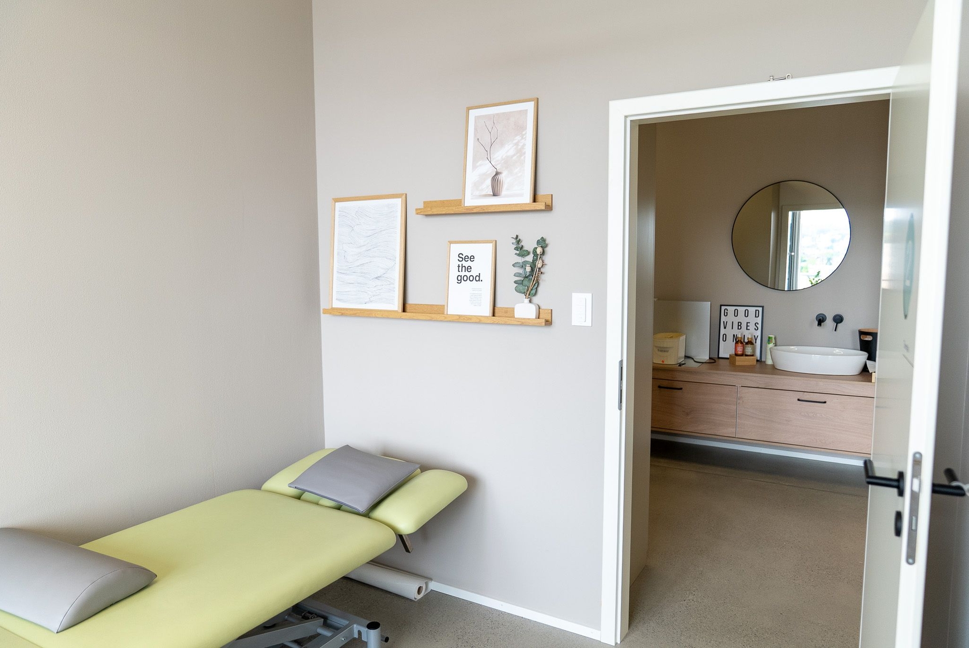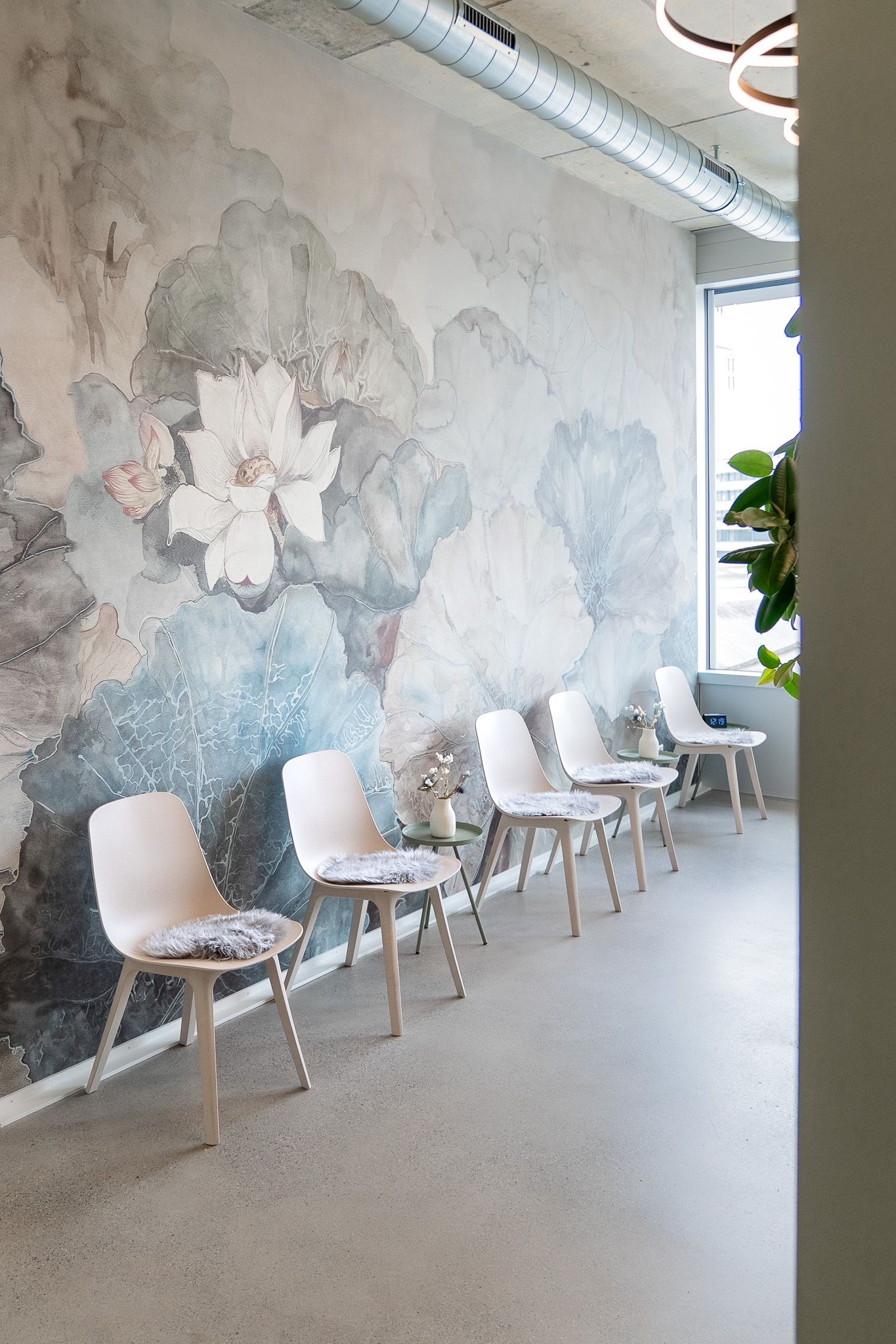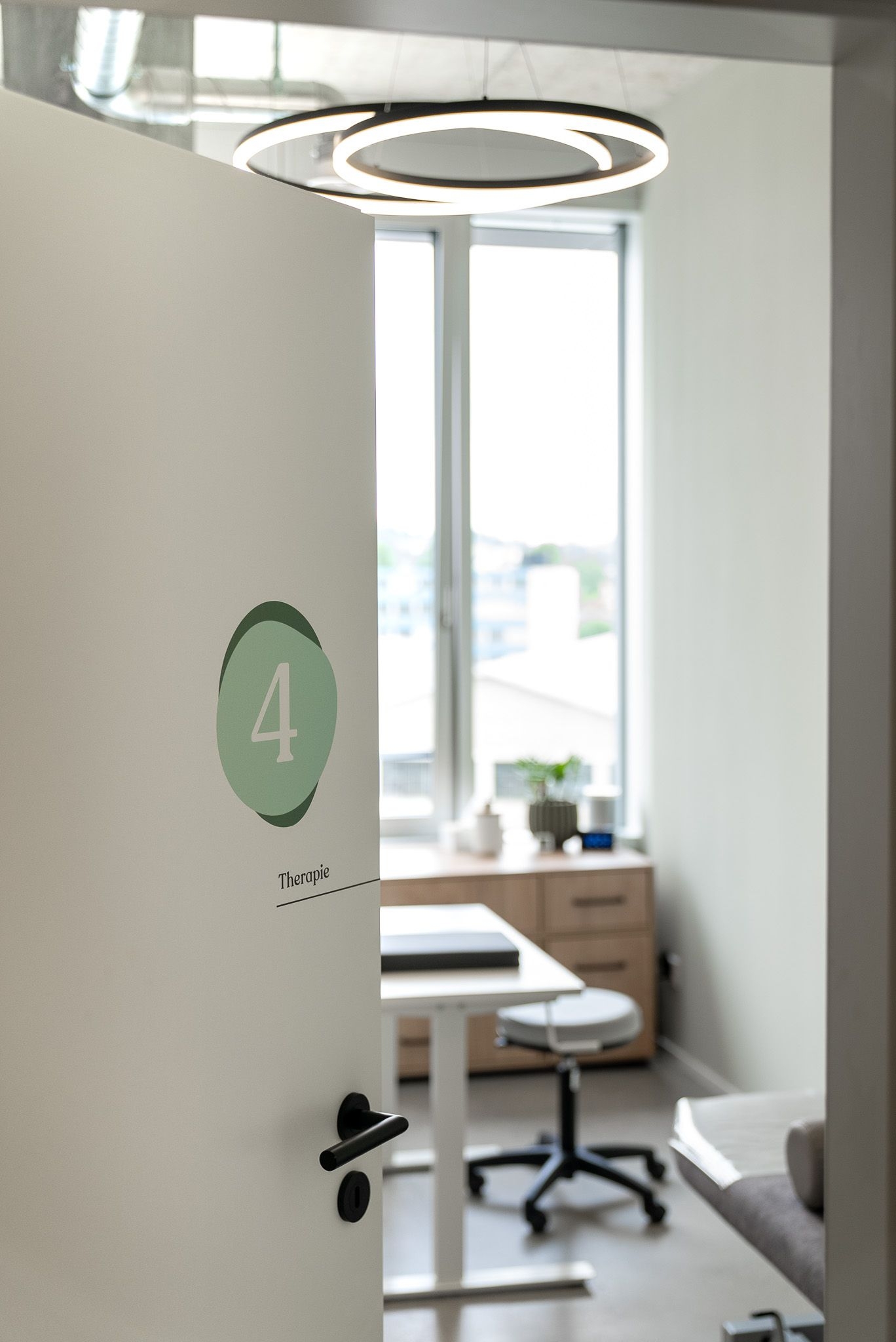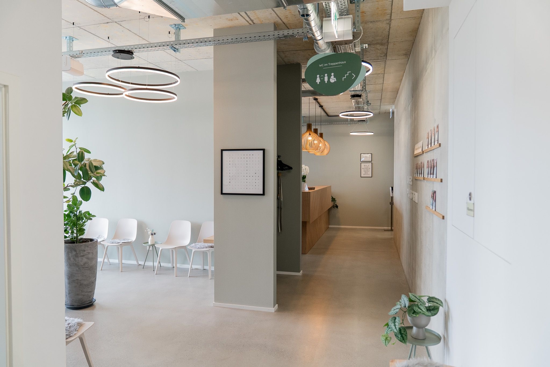 In enger Zusammenarbeit mit der Kundin entstand ein ruhiges, harmonisches Gestaltungskonzept, das Funktionalität und Wohlbefinden vereint. Die Basis bilden helle, zeitlose Farbtöne wie Cremeweiss und sanftes Beige, die den Räumen eine klare, offene Wirkung verleihen. Gedämpftes Salbeigrün schafft in Empfangs- und Behandlungsbereichen eine beruhigende Atmosphäre und unterstützt eine entspannte Raumwahrnehmung.