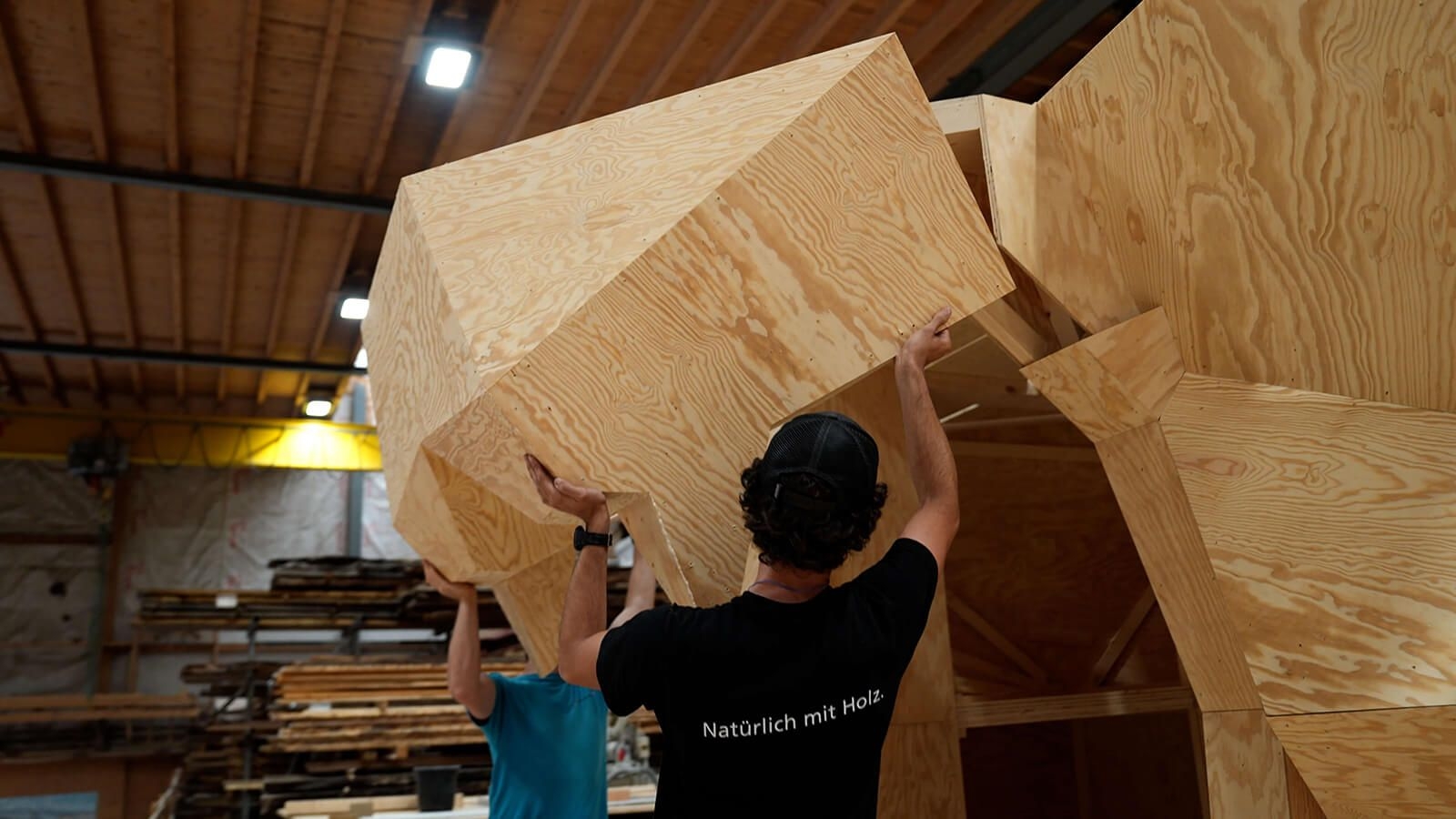 Facts: 92 % seiner Konstruktion bestehen aus europäischem Schichtholz. Allein die verbaute Menge speichert rund 1,4 Tonnen CO₂, eine Menge, die in der Schweiz in nur 6 Sekunden nachwächst.