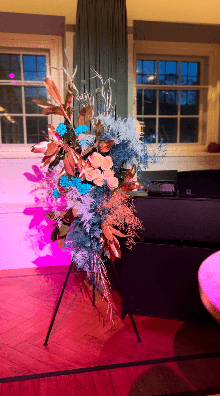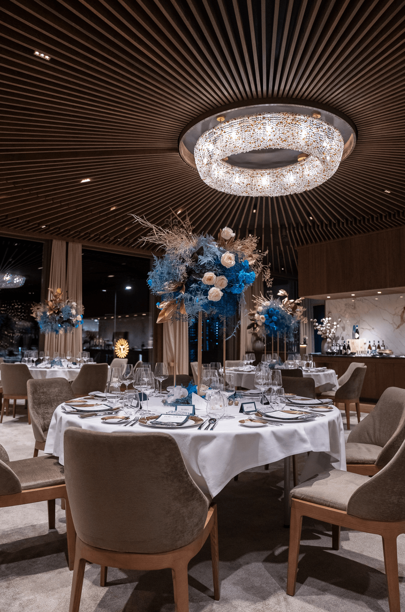 Die Verbindung von floralen Strukturen mit kunstvoller Lichtgestaltung verstärkt die magische Atmosphäre des Abends und schafft ein unvergessliches Erlebnis für die Gäste. Jedes Detail wurde präzise auf das exklusive Ambiente abgestimmt, um eine perfekte Symbiose aus Ästhetik und Raumwirkung zu erzielen.