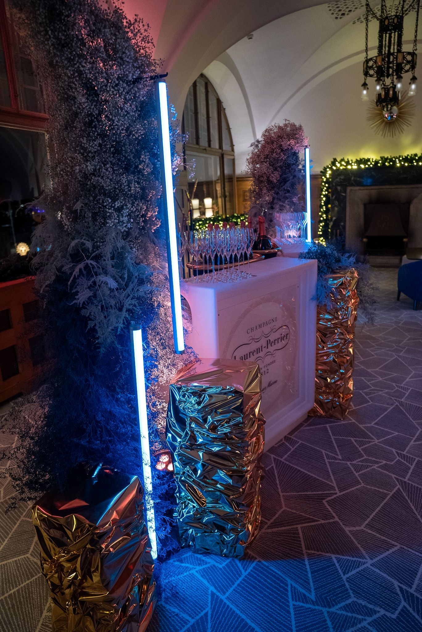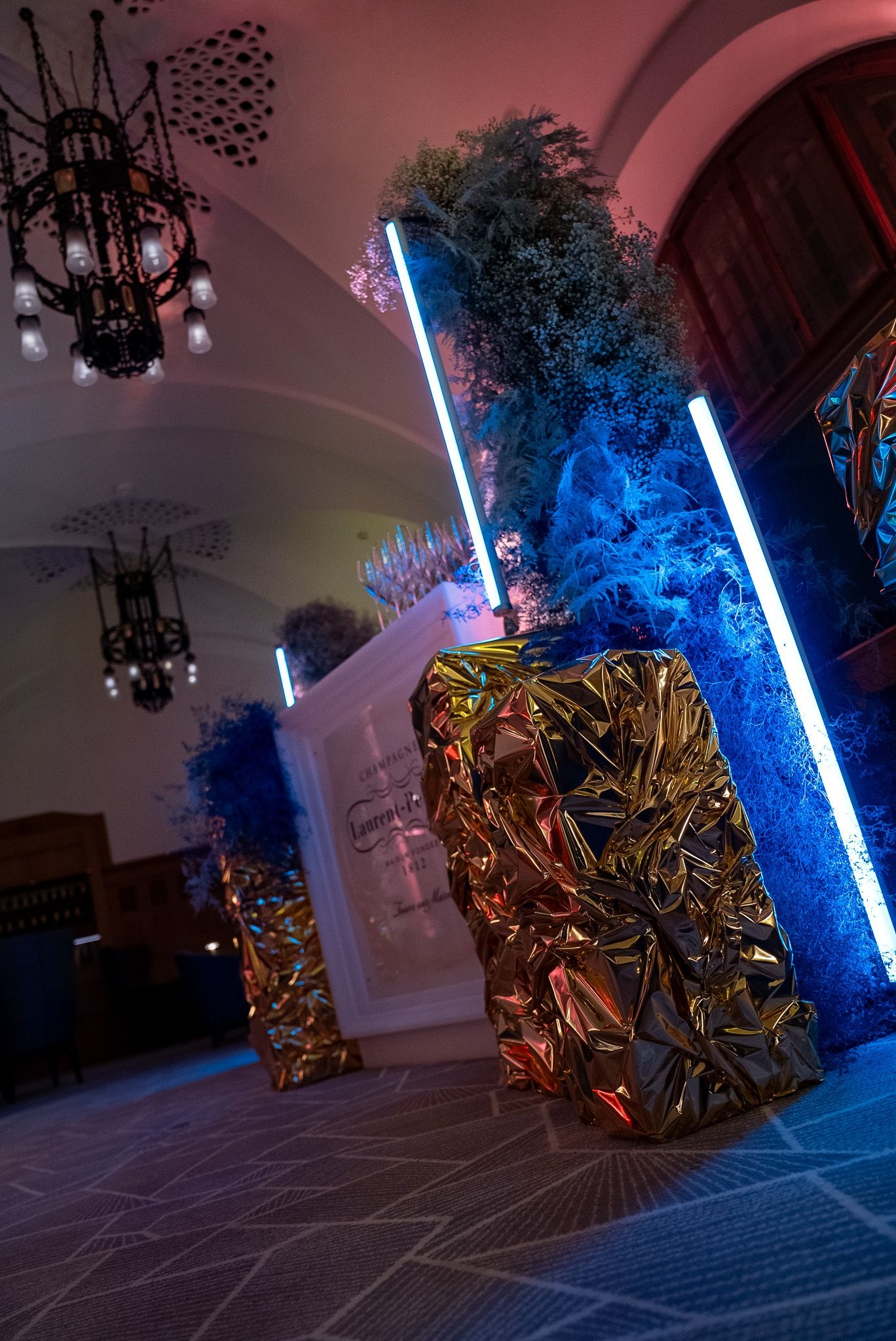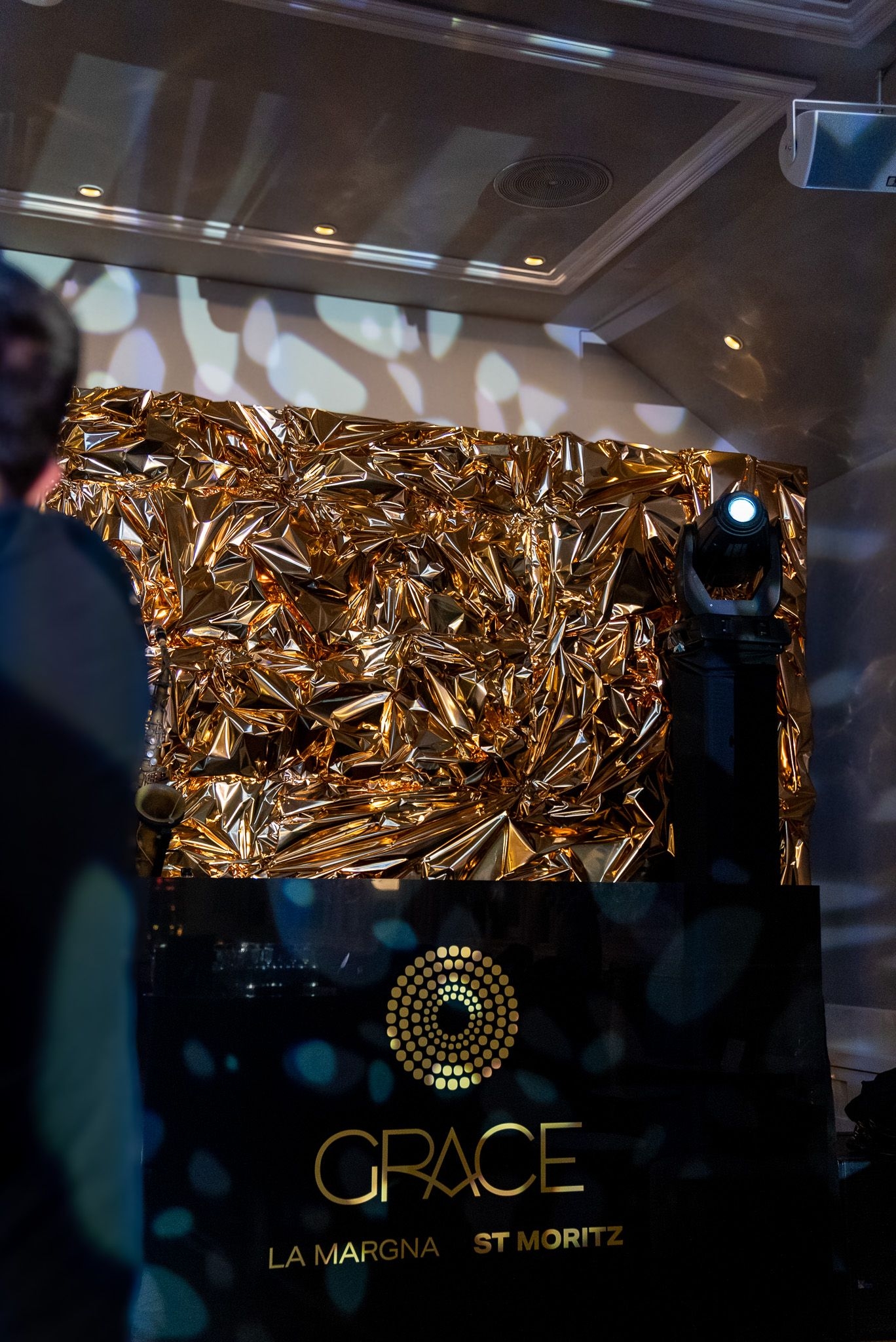 Ein besonderes Highlight war die kunstvolle Champagnerbar, in Szene gesetzt mit leuchtenden Neon-Elementen und goldenen Strukturen, die das festliche Ambiente perfekt unterstrichen. Die DJ-Stage wurde mit einer massgeschneiderten, goldfolierten Wand inszeniert, die durch gezielte Lichtprojektionen in ein dynamisches Kunstwerk verwandelt wurde – ein einzigartiges Signature-Design von Buravida.