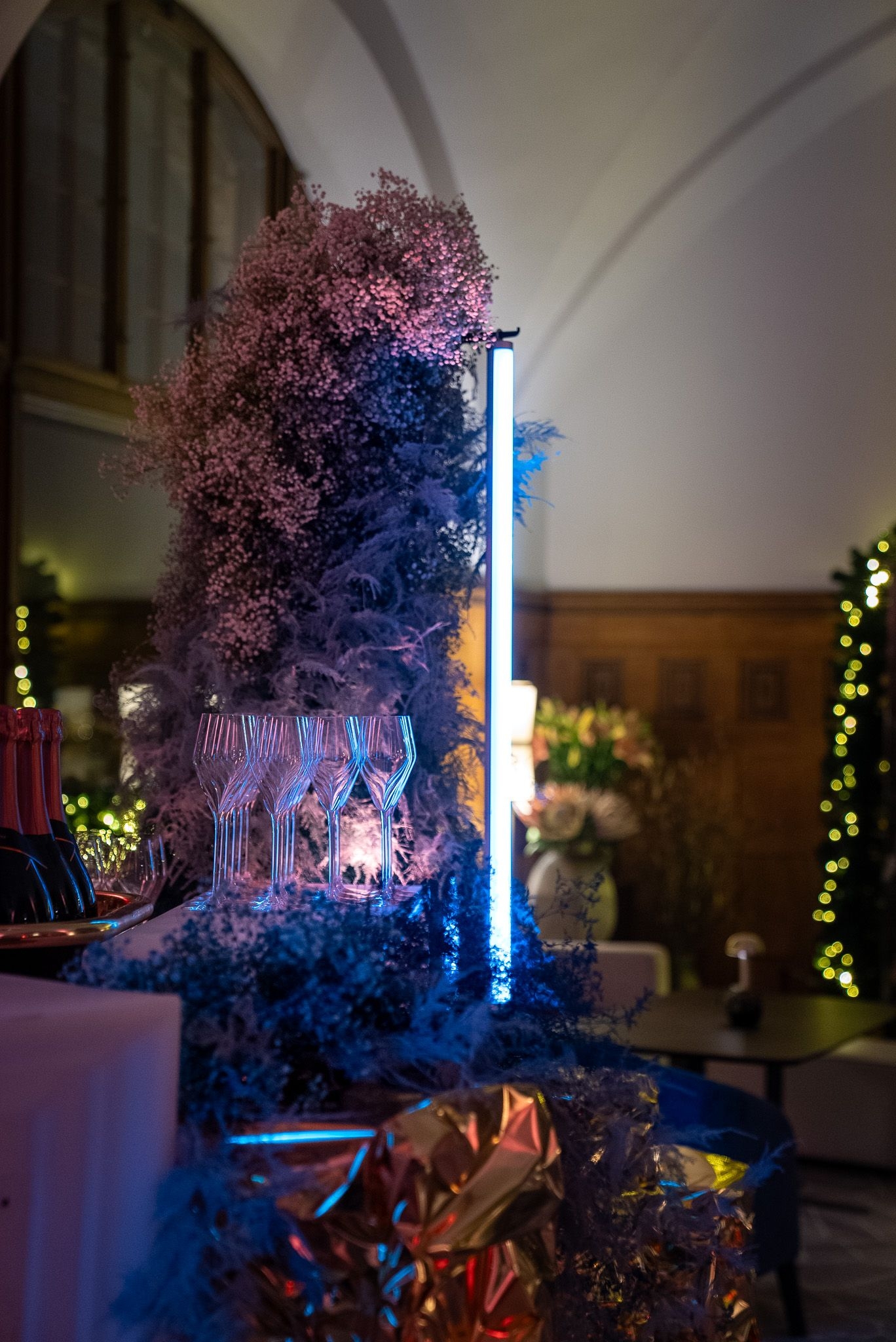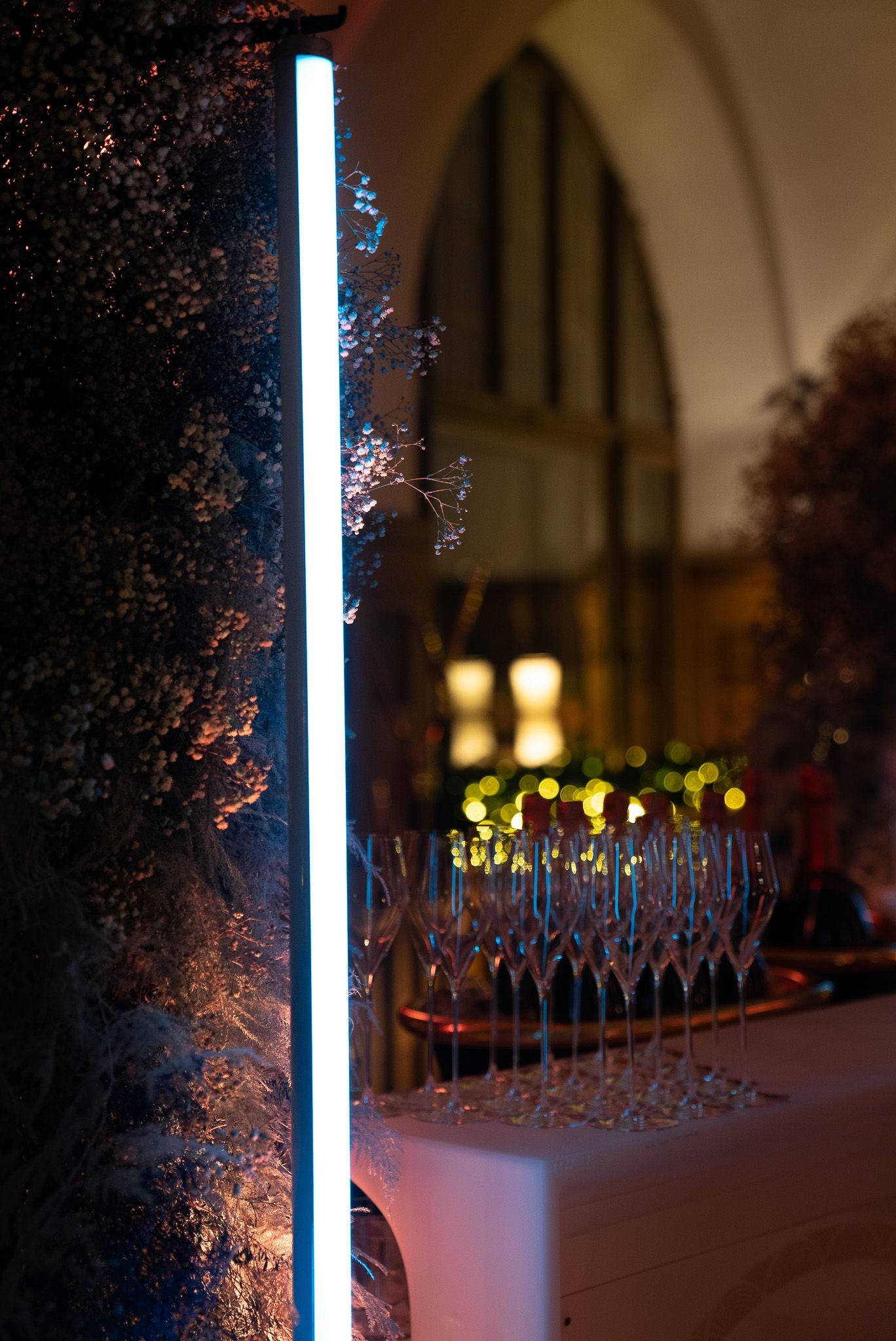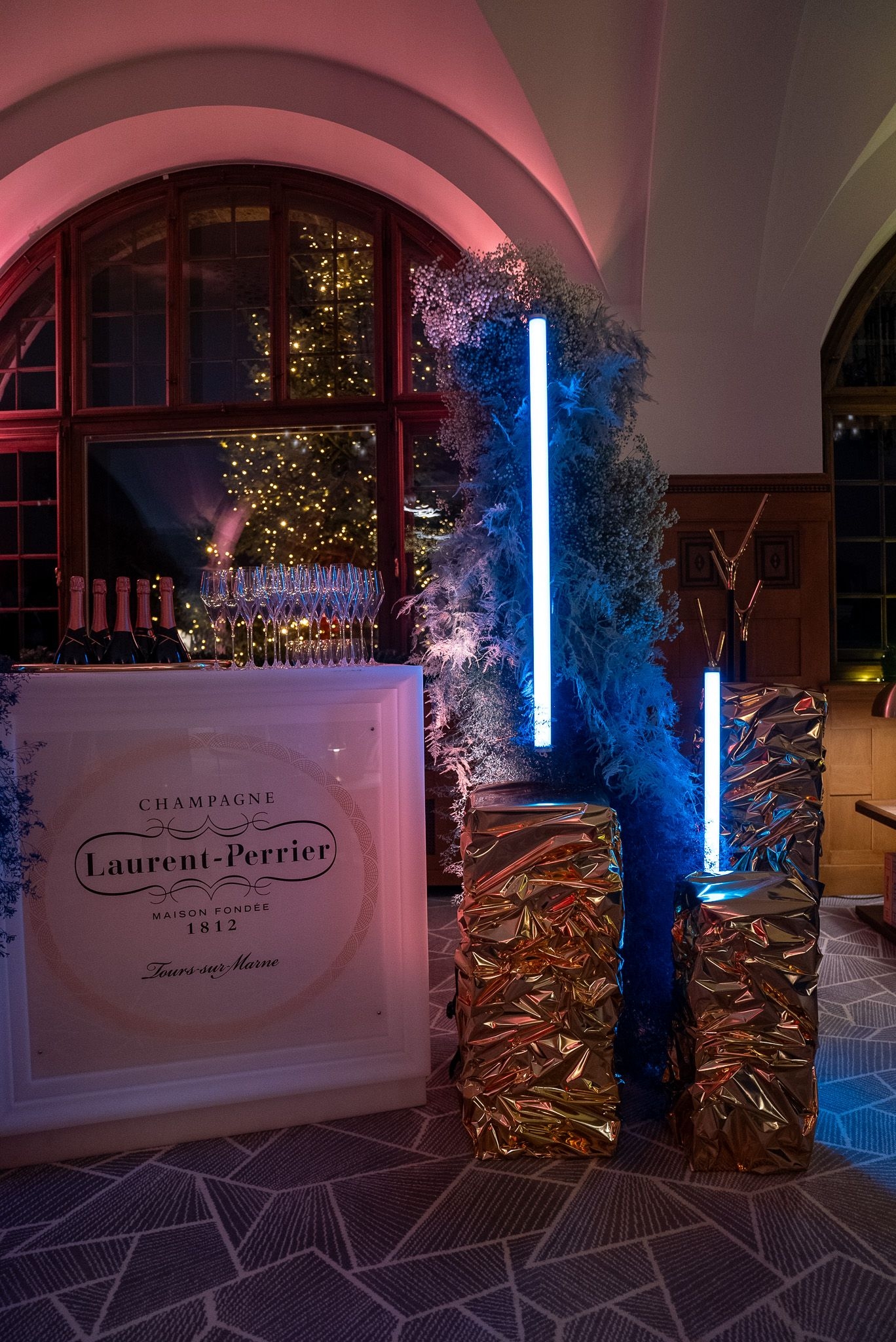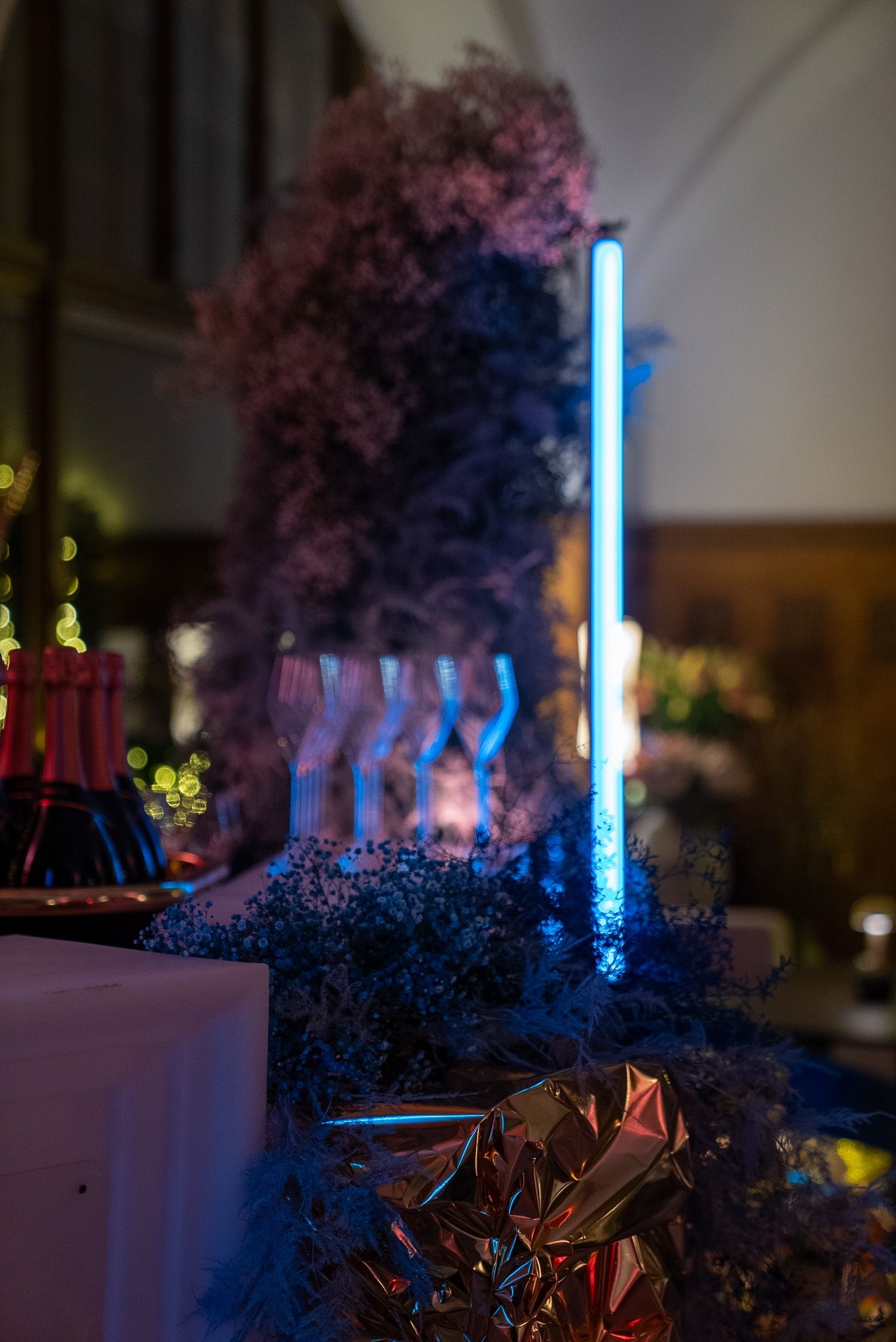 Ein besonderes Highlight war die kunstvolle Champagnerbar, in Szene gesetzt mit leuchtenden Neon-Elementen und goldenen Strukturen, die das festliche Ambiente perfekt unterstrichen. Die DJ-Stage wurde mit einer massgeschneiderten, goldfolierten Wand inszeniert, die durch gezielte Lichtprojektionen in ein dynamisches Kunstwerk verwandelt wurde – ein einzigartiges Signature-Design von Buravida.